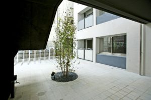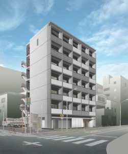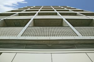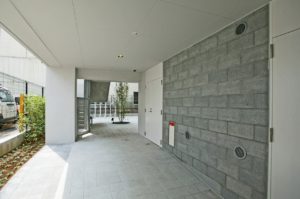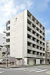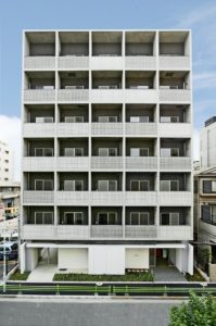 外観はグリッドデザインを基本とし、100mm角の穴あきブロックと、1住戸単位で構成されるコンクリートBOXによって特徴づけられている。一見して認識性の高い建物であることがわかるはずだ。